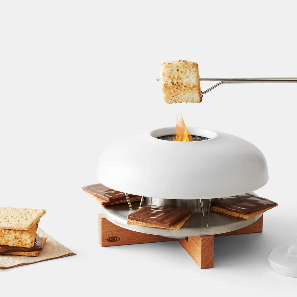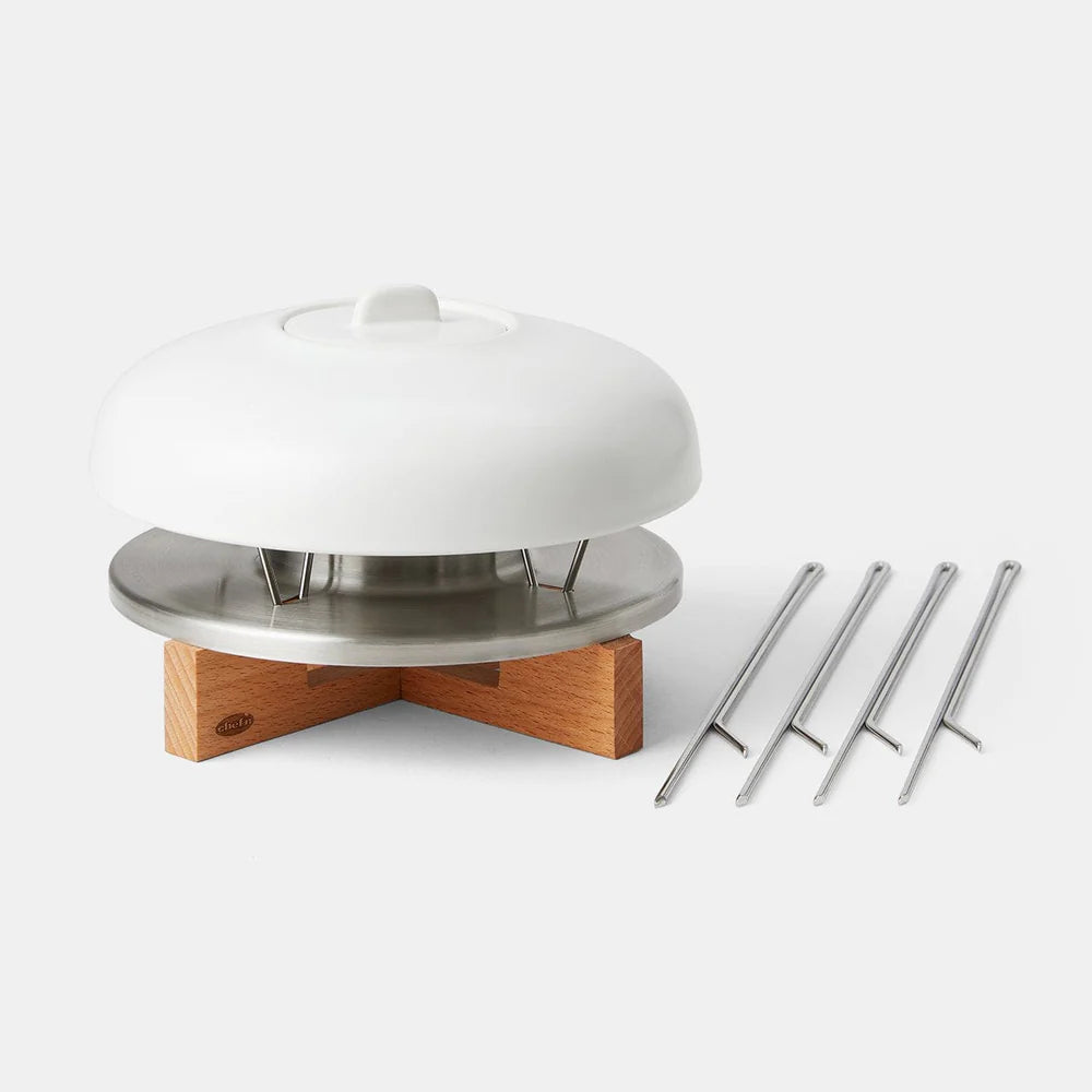 •Comes with four stainless steel roasting sticks, ceramic dome, wire mesh, flue, metal tray, wooden base, and snuffer